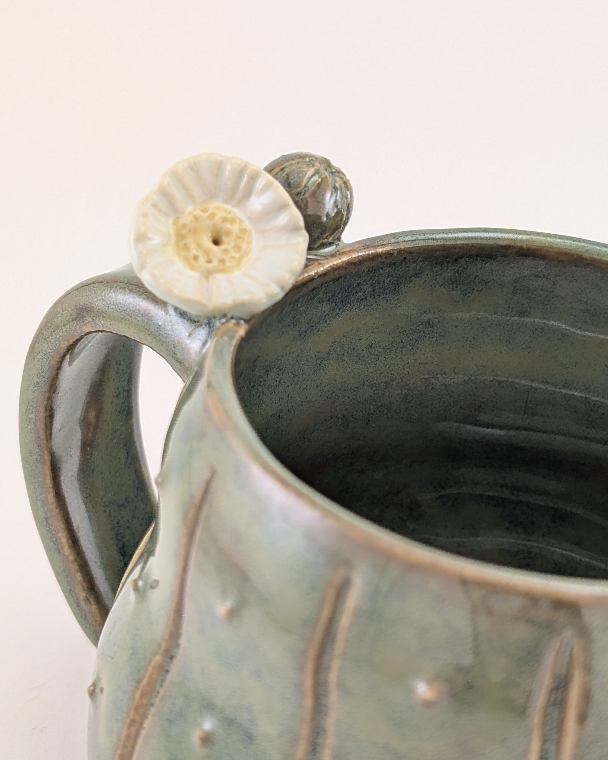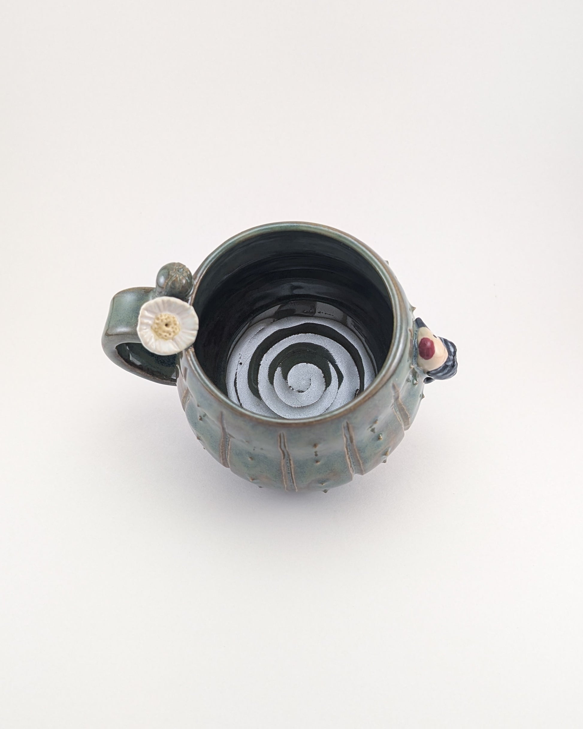 Wheel-thrown stoneware, hand-sculpted and painted with underglazes and glazes.