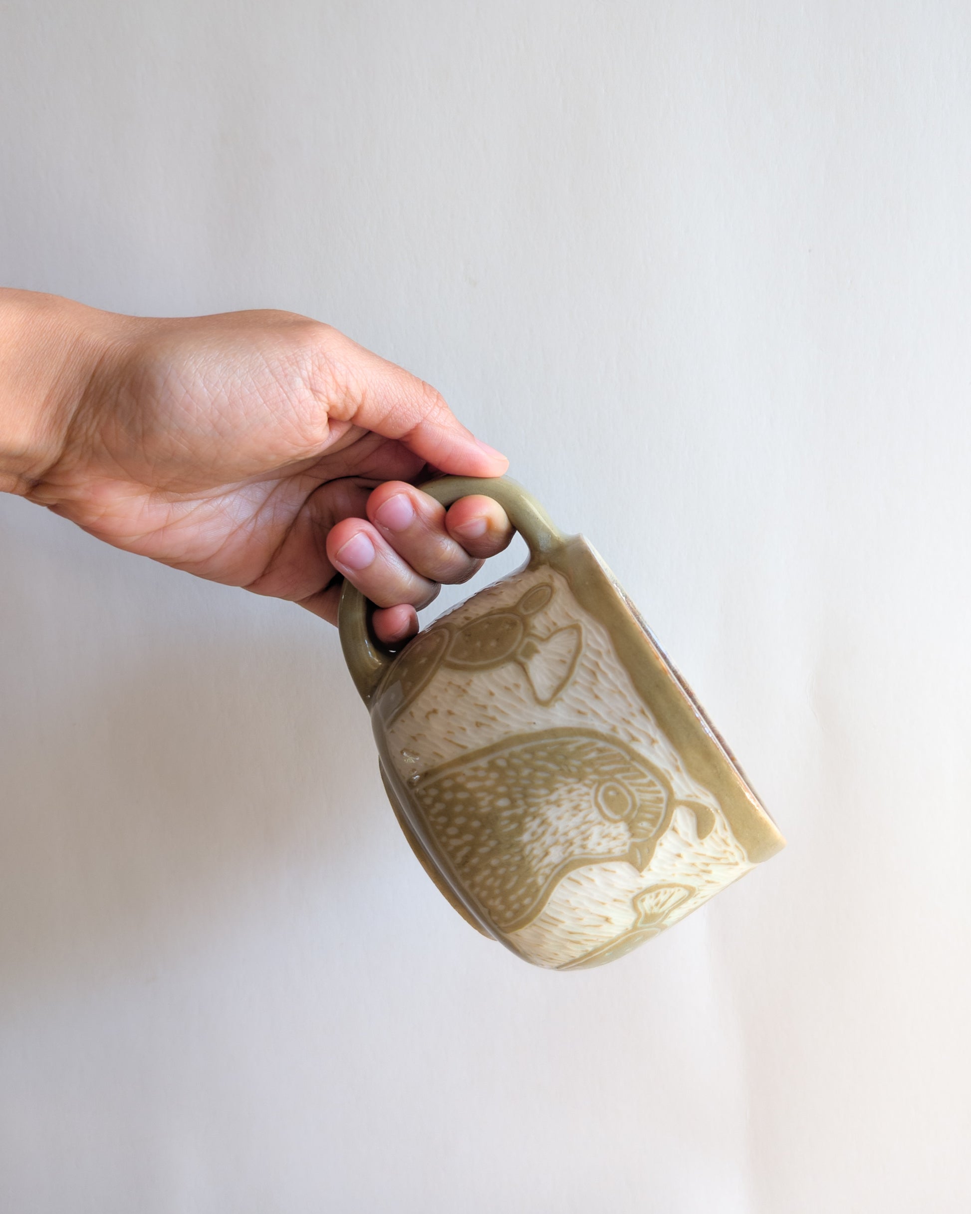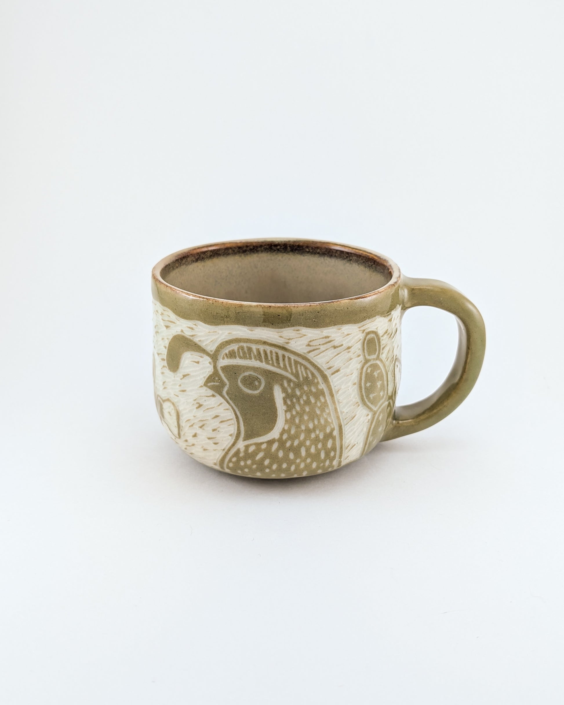 Hand-carved using the sgraffito technique, the mug features a pair (male and female) of Gambel’s or California quail nestled among prickly pear cactus—their source of both food and shelter. The piece reflects companionship and the interconnectedness of organisms sharing the same ecosystem.